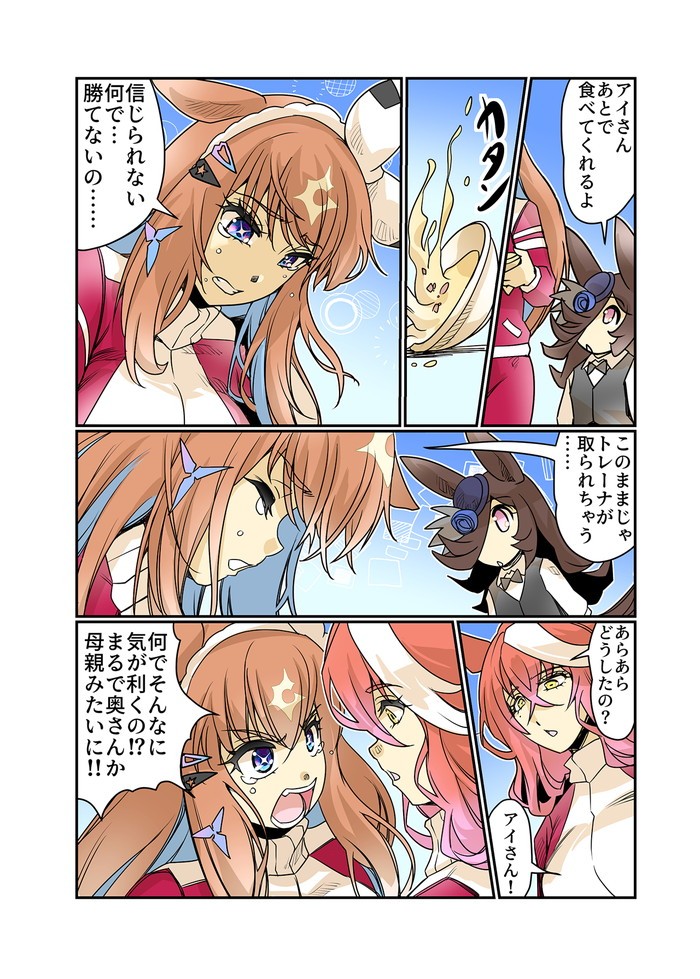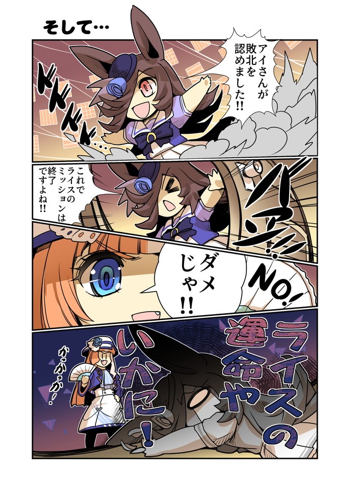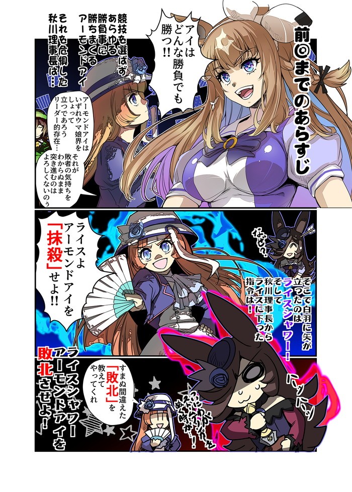 爆勝ちしすぎるアーモンドアイの将来を危惧した秋川理事長がライスシャワーに「敗北」を教えるよう命令を下した。ライスに下った秋川理事長の指令!