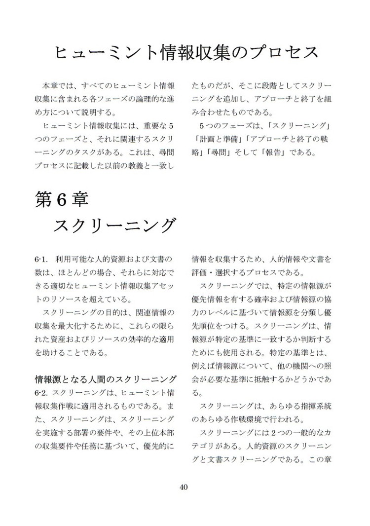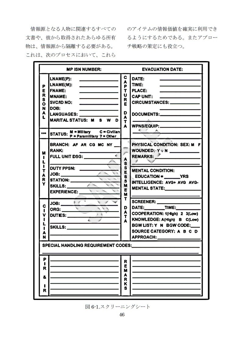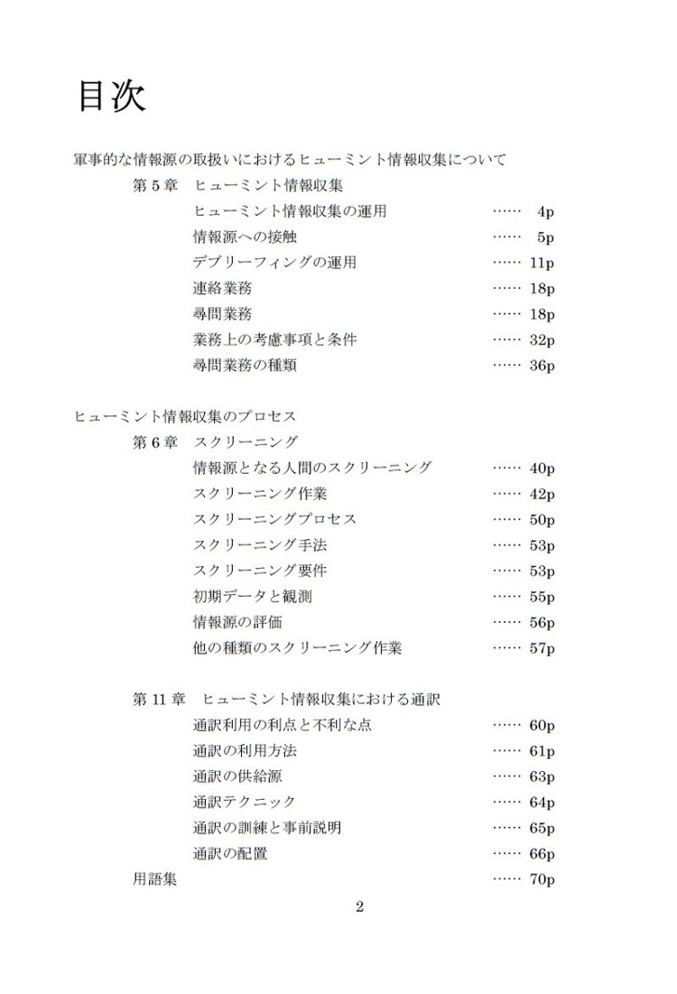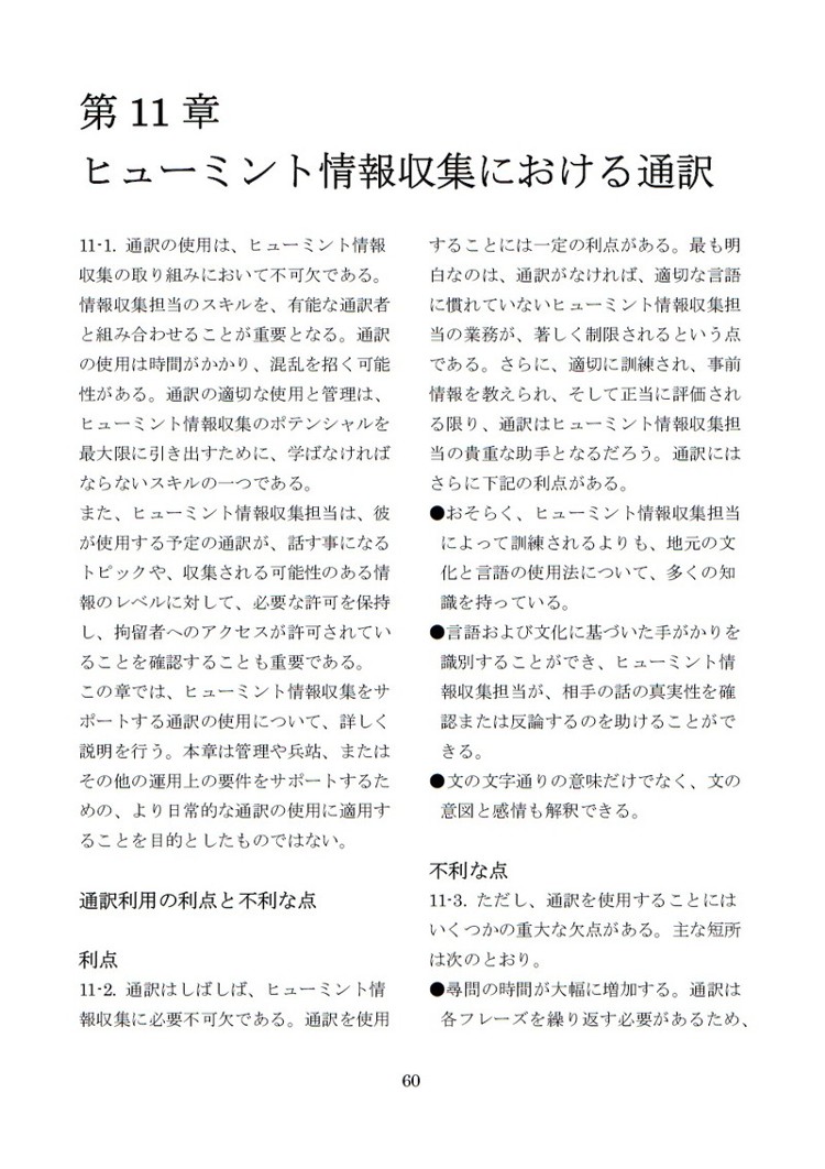 本書では主に、ヒューミント情報収集と、尋問相手の選別、尋問時の通訳の使い方について記載しています。