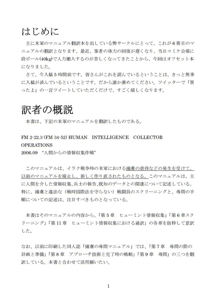 「捕虜の尋問マニュアル」の続きで、米軍のヒューミントマニュアルの翻訳です。B5サイズ 本文76P