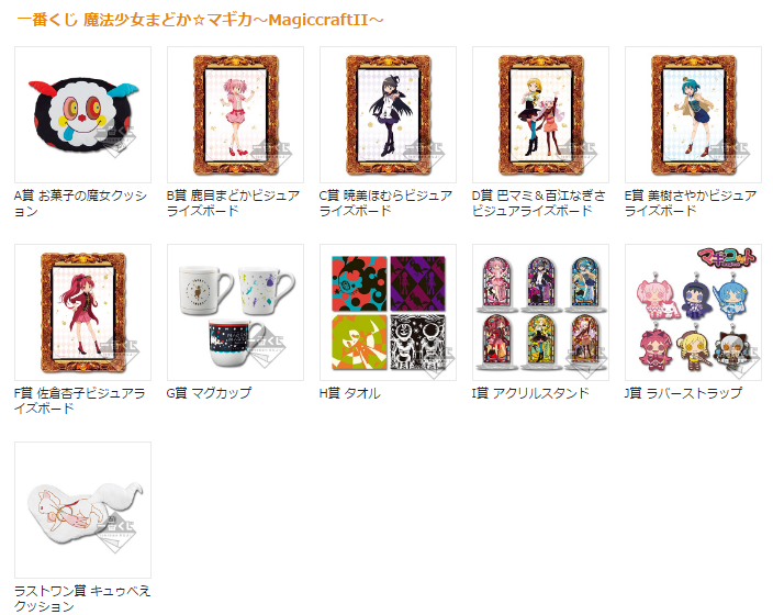 A賞は、「お菓子の魔女」の顔型クッションが登場。B賞~F賞は、「鹿目まどか」や「暁美ほむら」、「巴マミ&百江なぎさ」、「美樹さやか」、「佐倉杏子」6人の魔法少女たちを描きおろした、ビジュアライズボードがラインナップ。その他、マグカップやタオル、アクリルスタンド、ラバーストラップなど。