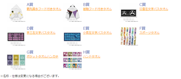 A賞 鶴丸国永フード付きタオルB賞 岩融フード付きタオルC賞 江雪左文字バスタオルD賞 宗三左文字バスタオルE賞 小夜左文字バスタオルF賞 スポーツタオルG賞 ポケットタオルハンカチH賞 ハンドタオルラストゲット賞 バスタオルダブルゲット賞 実施予定