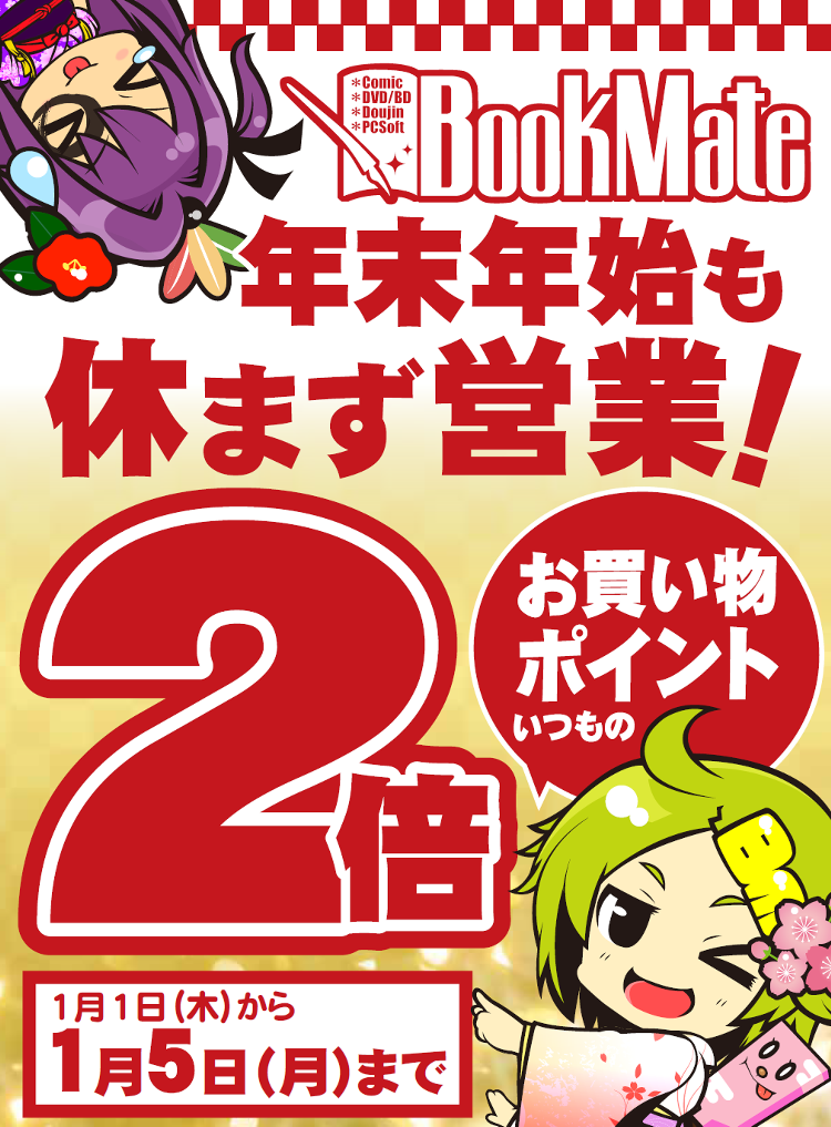 ブックメイト全店、年末年始も休まず営業いたしますが、12/31のみ、短縮営業とさせていただきます。