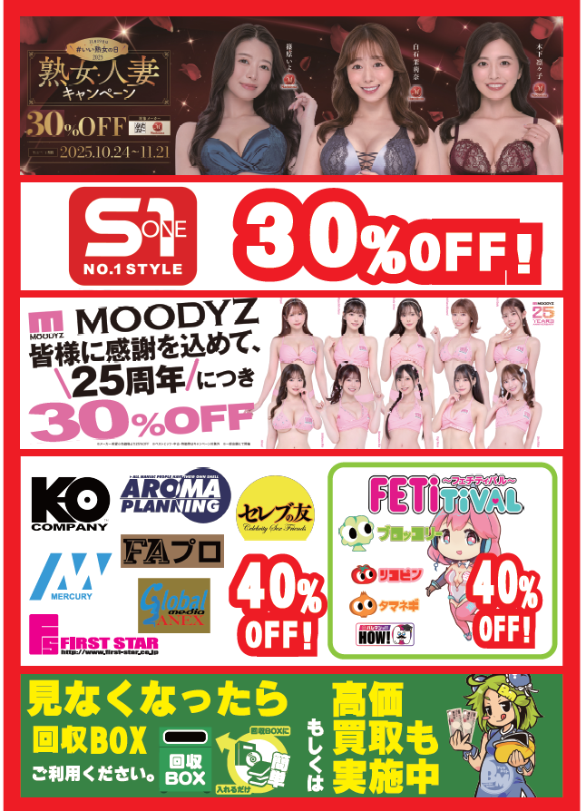 ※ムーディーズ30%OFF、マドンナ・溜池ゴロー30%OFFは終了しております。