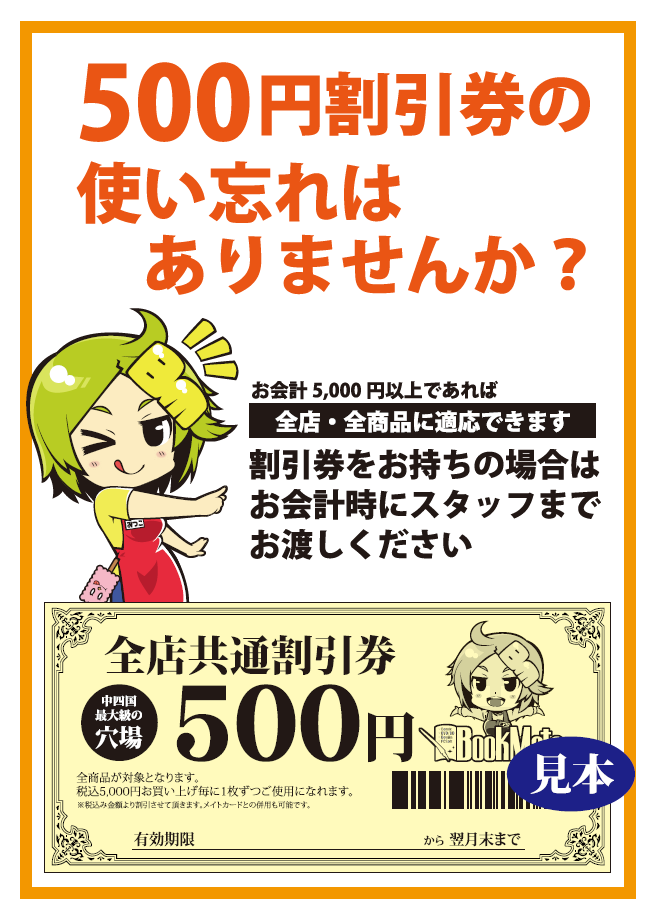 ブックメイトのマスコットキャラ「満子」とブックメイト看板が目印ですよ!