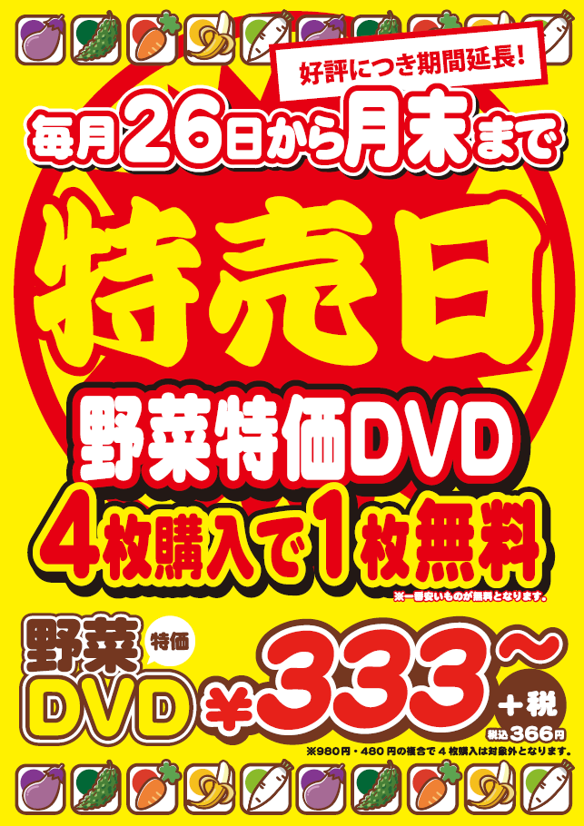 毎月26日~月末までは、野菜特価DVDが、4枚購入で一番お安いものが1枚無料になる野菜特売日を開催しています。