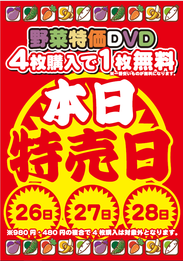 26日27日28日の3日間野菜特価DVDが4枚で1枚無料!!