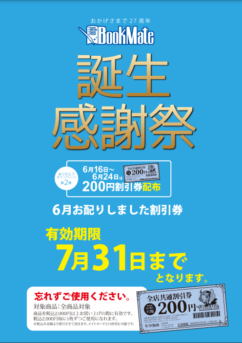 6月にお配りした誕生感謝祭の200円割引券の使用期限は本日7月1日~7月31日までとなります。