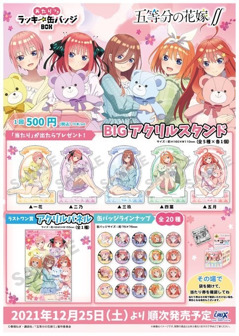 12/25発売から延期になっていたTVアニメ『五等分の花嫁』あたりつきラッキー缶バッジBOX本日深夜0時、日付が変わって2/5より