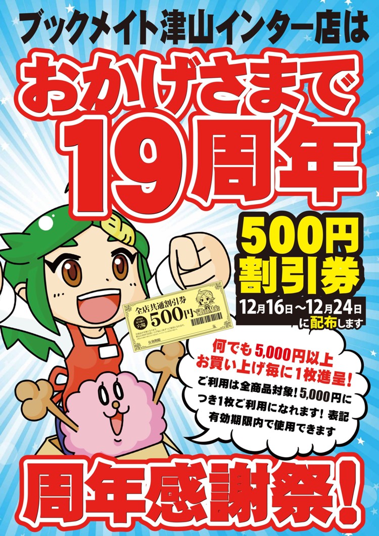 お陰様でブックメイト津山インター店は19周年をむかえることができました。