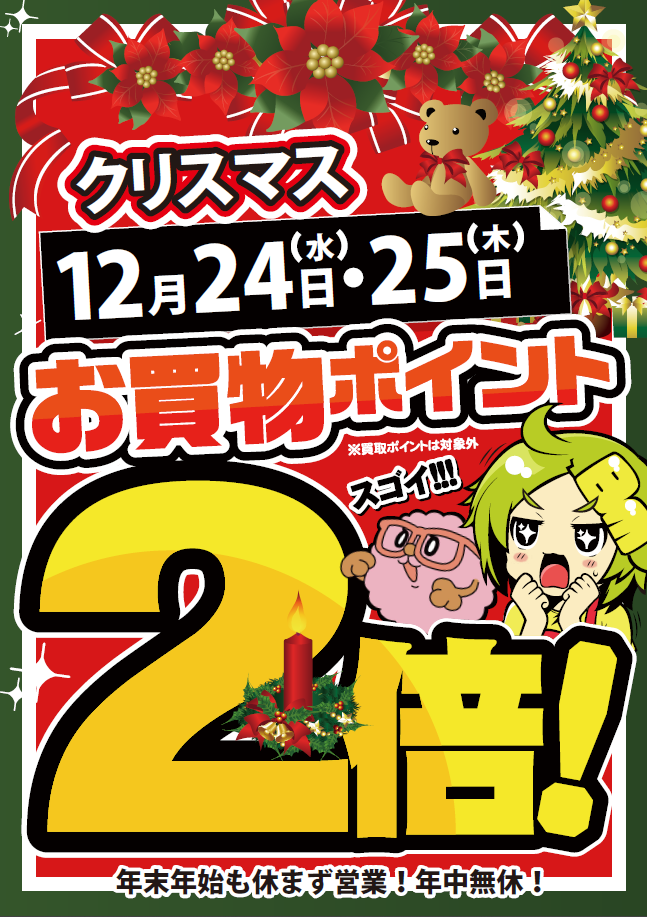 ※キャッシュレス決済はポイント付与にならないので、2倍デーでは現金でのお支払いをおすすめします。